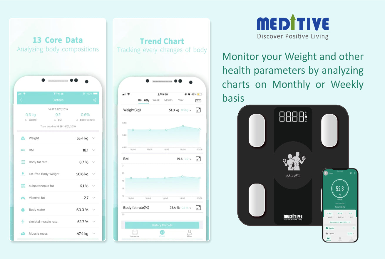 MEDITIVE SMART BMI WEIGHT SCALE LARGE CAPACITY 180 Kg, WITH 1 YEAR WARRANTY